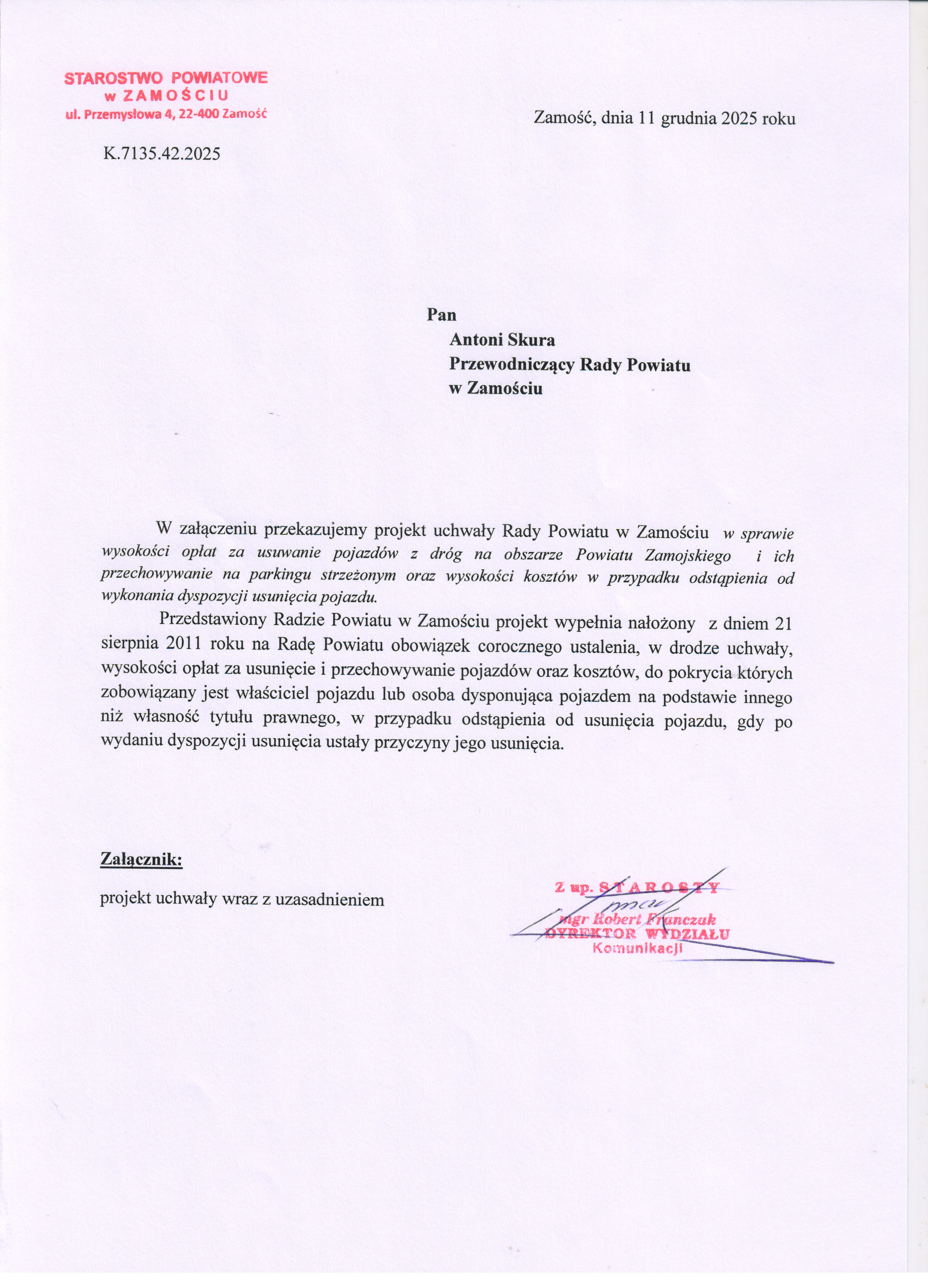 Zaopiniowanie projektu uchwały w sprawie wysokości opłat za usuwanie pojazdów z dróg na obszarze Powiatu Zamojskiego i ich przechowywanie na parkingu strzeżonym oraz wysokości kosztów w przypadku odstąpienia od wykonania dyspozycji usunięcia pojazdu.